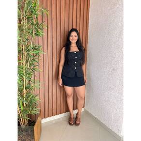 O short saia na imagem é uma saia plissada curta . Ela possui pregas finas em toda a sua extensão