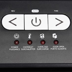 - 3 controles com botão de pressão (alimentação/automático, avanço e reversão); indicadores de status de LED (alimentação, superaquecimento, sobrecarga e porta aberta); compartimento de 6 galões com janela; rodízios incluídos