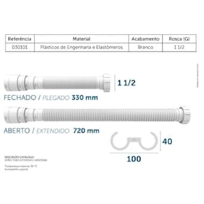 Sifão flexível universal branco - blukit Sifão flexível universal branco - blukit Feito à base de plástico de engenharia os sifões blukit são de alta durabilidade, não aderem a gordura e resistem a água quente com temperaturas de até 90ºc. Além disso, aguentam a baixa e alta pressão, apresentando uma ótima vedação em todas suas aplicações. Material plástico Comprimento aberto 720mm Comprimento fechado 330mm 12 meses com o fabricante Pode ser adaptado para : dn38 /dn40 /dn 48 / dn 50 Descrição: Sifões tubos extensivos blukit são a melhor opção para quem busca um produto versátil e prático para escoamento de águas servidas dos ambientes. Fabricados em plásticos de engenharia, ultrarresistentes que suportam extremas temperaturas da água, com acabamento branco ou cinza. Seu uso correto assegura um ambiente livre dos maus odores do esgoto. Qualidade para você