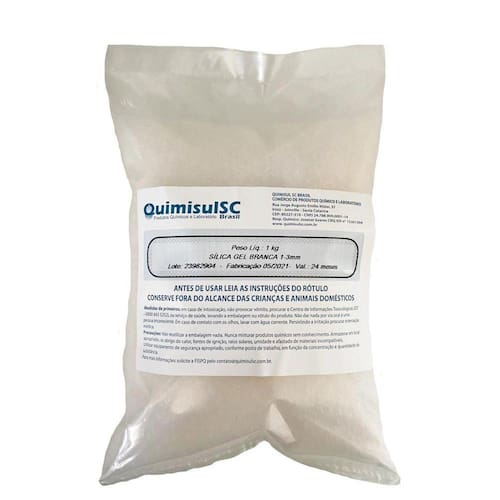 Pacote 1 kg granulometria 1-3 mmSinônimos: Dióxido de Silício Sintético Anidro; Sílica Sintética Amorfa; Dióxido de Silício.Tipos: Sílica Gel Pérola BrancaGrupo químico: SílicaComposição: Sílica amorfa SiO2 , silicato de sódio.N ONU: Não classificadoCAS: 112926-00-8Aspecto: Pérolas irregulares de coloração branca, inodoras.Ph suspensão aquosa 5% : 3,5 a 8,0Teor de SiO2: Mín. 80,0%Solubilidade: Insolúvel em água.Aplicações: Agente desumidificante e desidratante. Absorve a umidade eliminando o mofo.A sílica gel é utilizada em vários segmentos, damos destaque para seu uso em alimentos,Produtos farmacêuticos, aparelhos eletrônicos, sistemas de telefonia, maquinário e produtos de Exportação Marca: For Industry