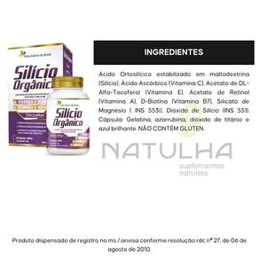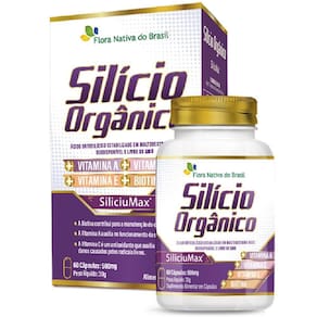Silício orgânico siliciumax + vitaminas 500mg 60 cápsulas - flora nativa Suplemento alimentar em cápsulas a base de silício orgânico (siliciumax) com vitaminas a, c, e e biotina. O silício orgânico da flora nativa do brasil é composto por vitaminas e siliciumax, o silício em sua forma máxima. Siliciumax é o suplemento de silício orgânico que auxilia na integridade estrutural da pele, do cabelo e das unhas, além de proporcionar outras contribuições ao organismo Como tomarSugere-se a ingestão de 1 (uma) cápsula deste produto 2 (duas) vezes ao dia, preferencialmente junto das principais refeições, ou de acordo com orientação profissional. Tabela nutricionalPorção de 1000mg (2 cápsulas) Vitamina a 600mcg 100%Vitamina c 10mg 100%Vitamina e 10mg 100%Biotina 30mcg 100%Silício 5mg na dose elementar IngredientesÁcido ortosilícico estabilizado em maltodextrina (silício), ácido ascórbico (vitamina c), acetato de dl-alfa-tocoferol (vitamina e), acetato de retinol (vitamina a), d-biotina (vitamina b7), silicato de magnésio ( ins 553i), dióxido de silício (ins 551). Cápsula: gelatina, azorrubina, dióxido de titânio e azul brilhante. Não contém glúten.