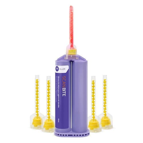 Silicone de Adição Scan Bite Yller (1 unidade 50ml + 6 ponteiras) Indicado para registro de mordida em todas as técnicas: máxima intercuspidação, relação cêntrica, oclusão cêntrica, oclusão cêntrica ortodôntica, avaliação diagnóstica de desordens de ATM.