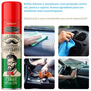 APLICAÇÕESPode ser utilizado em superfícies de borracha, vinil, plástico, madeira e outras superfícies de painéis, frisos laterais, console, pneus e para-choques. Pode ser utilizado em móveis de madeira. VANTAGENSProteção UV. Penetra e trata as superfícies do veículo, recuperando o brilho e a beleza autêntico do painel deixando um agradável perfume dentro do veículo, sendo o produto ideal para proteger, conservar e dar brilho. O seu formato em aerossol proporciona uma melhor cobertura e mais facilidade na aplicação.