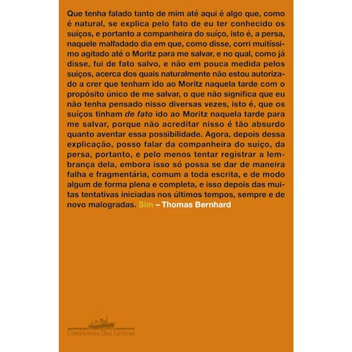O narrador desta novela tinha acabado de chegar à casa de seu amigo Moritz quando passos se fizeram ouvir na porta da frente. Os suíços, anunciou o velho negociador de imóveis. O plural, porém, deveria estar no singular: um suíço, sim, e sua esposa, mas ela talvez armênia, ou persa. O casal havia aparecido de surpresa para jantar e discutir novos negócios na região, sendo o suíço o responsável por conduzir a conversa, enquanto a mulher se mantinha em silêncio. Sua introspecção chama atenção do narrador, um homem também introspectivo que procurara Moritz para desabafar sobre seus pensamentos sombrios, quase suicidas, quando se deparou com alguém que poderia entendê-lo. A solidão a que se propôs quando decidiu dedicar-se a seus estudos científicos no interior, longe das distrações dos amigos, dos amores e das emoções da cidade grande, afundaram o narrador em um processo depressivo que parecia não ter volta ? até o encontro com a persa. Combinados de passear numa floresta de lariços, os dois nutrem diálogos filosóficos e trocam angústias e tormentas que culminam na resposta definitiva que dá título a este livro. O relato frustrado e frustrante de seu narrador, em um ciclo que tira o fôlego ao mesmo tempo que provoca o riso e o desespero absoluto, é o exemplo perfeito da literatura de Bernhard ? hipnotizante, inquietante, única. Sim é mais uma de suas obras-primas.