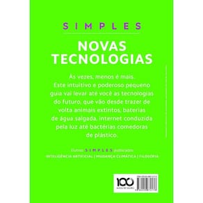 Colônias em outro planeta? Bactérias que comem plástico? Drone de passageiros? Compreender novas tecnologias nunca foi tão simples Este pequeno e poderoso guia mergulha no universo fascinante das novas tecnologias e como elas estão transformando o mundo em que vivemos. O título faz parte da coleção Simples, que aborda temas atuais, e muitas vezes complexos, de forma simples e direta. . Com infográficos, ilustrações e textos dinâmicos, Simples – Novas Tecnologias revela inovações surpreendentes que estão redefinindo o futuro. Descubra como a ciência está trazendo de volta animais extintos, conheça baterias feitas de água salgada que podem revolucionar a energia limpa, explore a internet conduzida pela luz e entenda como bactérias comedoras de plástico podem ajudar a salvar o planeta. . A obra é ideal para estudantes, educadores e curiosos, e também para os fãs da coleção best-seller As Grandes Ideias de Todos os Tempos.