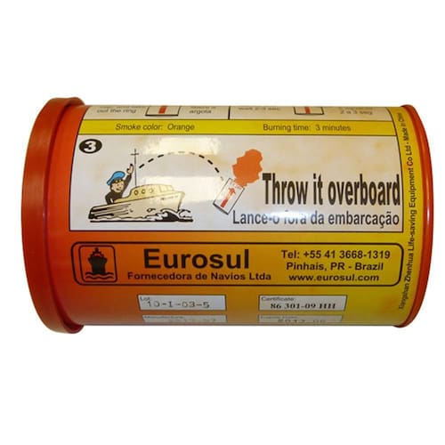 Fumígeno flutuante eurosul laranja 3min ccy3-2 É constituída de um corpo metálico com acionador e tampa rosqueável, internamente está alojado o misto fumígeno prensado, com acionador composto de: mola, percussor e o gatilho com cordão acima do retardo. Utilizado para sinalizar situações de perigo à longa distância durante o dia, emite uma densa fumaça de cor laranja. Composição do misto fumígeno É composto de clorato de potássio, lactose, pigmento laranja, cera, óleo, pigmento laranja, pó de pedras pomes, goma arábica, etanol e água, misturadas em proporções convenientes.