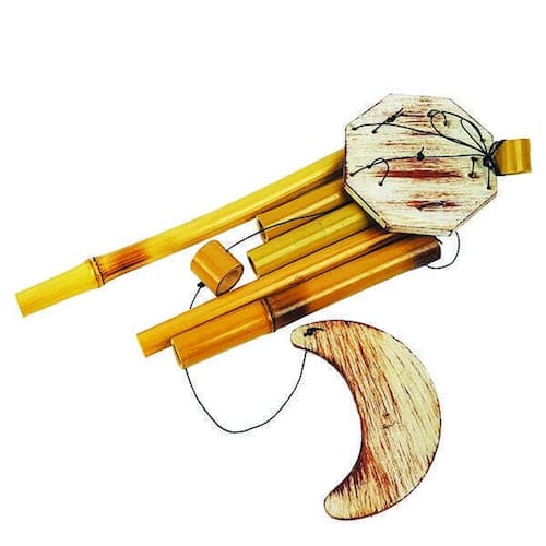 Este modelo em Bambu possui elementos naturais, possui 5 tubos de 25cm a 43cm.Possui uma Lua na ponta para energizar com mais potência.Possui gancho anel para pendurar em qualquer lugar, como varandas, pátios, janelas e etc.