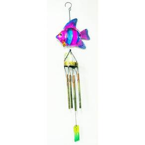 Característica:O sino dos ventos tem detalhes em metal, como o aro de sustentação e partes do corpo da peixe, sendo que essa ainda tem partes em vidro.O suporte em plástico na parte inferior é onde a pessoa pode segurar e balançando fazer os sinos soarem, além do próprio vento que também o faz, ainda que de forma mais sutil.