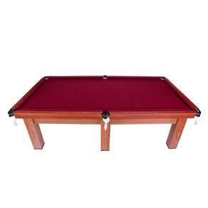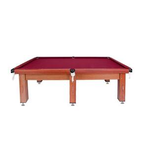 Mesa de sinuca com medidas externas 2,70x1,43m confeccionada em madeira maciça cedrinho em tom de mogno, campo de jogo com 03 pedras em ardósia polida e tapeçadas com tecido acrílico Thais na cor vinho, modelo com 06 pés, caçapas em redinhas e pés niveladores para melhor nivelamento da mesa.