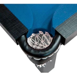 Mesa de sinuca com campo de jogo e estrutura do caixote em MDF de 15 mm, jogo de caçapas em courvin com redes, tecido poliéster na cor azul e acabamento final revestido em ebano escuro.