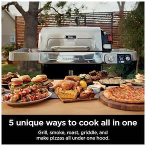 O sistema de cocção externa Ninja FlexFlame é uma estação completa para uso ao ar livre que combina churrasqueira e defumador a gás com apoio elétrico e um cooler rígido FrostVault de 30 litros. Ele permite grelhar, defumar, assar, utilizar chapa (griddle) e preparar pizzas com acessório específico, reunindo cinco modos de cocção em um único equipamento com controle digital de temperatura.