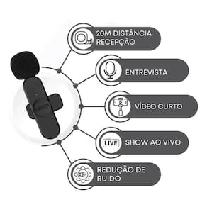 Este Sistema Microfone Sem Fio Kaidi KMF5-C Wireless USB-C para Smartphones possui frequência wireless de alta capacidade, transmissor com clipe removível e autonomia de até 4 horas, assim como oferece uma alta qualidade de som, sendo portátil e muito fácil de usar. Projetado para captação de 1 pessoas, o conjunto de transmissor e traz tecnologia Plug and Play que não necessita de aplicativos e drivers, basta conectar no celular e usar. É perfeito para streaming , reuniões, gravações, criação de e muito mais.Desenvolvido com um transmissor sem fio e um compacto, o Microfone Sem Fio Kaidi KMF5-C USB-C oferece uma captação com alta sensibilidade, áudio 360 graus e resposta rápida para que você grave todos os detalhes de som. o microfone Lapela para Smartphone é emparelhado automaticamente imediatamente após a conexão, sem necessidade de softwares adicionais. no , uma porta USB-C disponível permite conectar um carregador não incluso para alimentar o seu celular enquanto está utilizando os microfones sem fio.O microfone Lapela Sem Fio para Smartphones integra baterias de longa duração e seu alcance sem fio trabalha com uma distância de até 20m sem obstáculos . Áudio limpo e preciso, captação sem fio 360º Plug USB-C para Smartphones e Tablets Transmissor com Microfone Integrado suporta gravação de 1 pessoa simultaneamente Baixa latência, delay inferior a 50 milissegundos Alcance de até 20 metros em locais sem obstáculos Circuito inteligente com redução de ruído Bateria interna de alta autonomia, duração de até 4 horas Compatível com uma variedade de dispositivos USB-CAdequado para gravações e transmissões Youtube, Facebook, Live Streaming, Gravação de Vídeo, Vlog, TikTok, Entrevista, Aulas Online e muito mais.Imagens ilustrativas. Homologação Anatel: 110052213346 Ean: 6954268454102