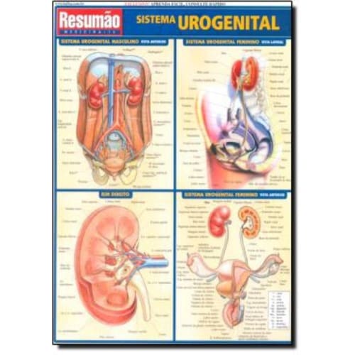 Apresenta imagens com identificações anatômicas dos órgãos que fazem parte do sistema urogenital. Vista lateral e detalhamento do sistema urogenital feminino; vista lateral e detalhamento do sistema urogenital masculino; sistema urinário masculino. Traz também imagens do rim direito, do corpúsculo renal e do néfron.
