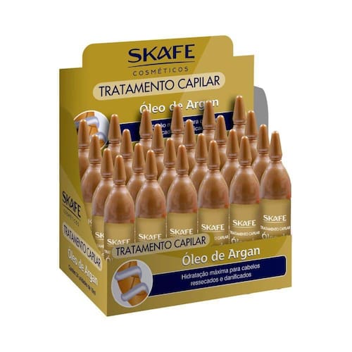 Skafe óleo De Argan Ampola Capilar 24x10ml DESCRIÇÃO:Ampola de Tratamento Capilar Óleo de Argan Skafe é indicada especialmente para dar aos cabelos um cuidado especial, protegendo e hidratando profundamente o fio graças as vitaminas presentes em sua fórmula. AÇÃO/ATIVOS:Sua fórmula é enriquecida com óleo de puro de Argan, que é um poderoso antioxidante rico em vitamina A, D e E, proporcionando aos cabelos brilho, controle do frizz, proteção e hidratação. Imagem meramente ilustrativa. O produto pode ter variação de cor ou desenho, porém as características gerais são as mesmas especificadas na descrição do produto.MODO DE USAR:Com o cabelo lavado e úmido, aplique o conteúdo em todo o comprimento, da raiz às pontas. Massageie e deixe agir por alguns minutos. Em seguida, enxágue totalmente. Outra opção de uso é misturando o conteúdo no condicionador ou máscara de tratamento para potencializar sua ação. ESTE KIT CONTÉM: 01 UNIDADE DE SKAFE ÓLEO DE ARGAN AMPOLA CAPILAR 24X10MLSkafe Ãleo de Argan Ampola Capilar 24x10ml