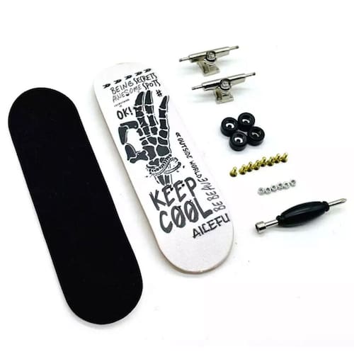 - Lindo Design - Skate de dedo, réplica fiel do skate em tamanho real. - Decks/ Shape feitos com 5 folhas de madeira prensada com resina de alta qualidade. - Trucks de metal com amortecedores já configurados para gerar maciez ideal para melhores Triks/ Manobras. - Rodas com rolamentos lubrificados para maior desempenho e durabilidade.