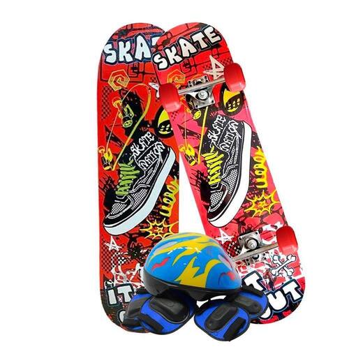 Skate Infantil Estampado Grafite Kit Equipamentos de Proteção - Andar de skate proporciona diversas emoções e sensações únicas, além de ser uma ótima atividade física, seu filho vai vivenciar todas essas coisas boas de uma maneira mais segura, acompanha capacete, cotoveleiras e joelheiras, também inclui bolsa para transporte.