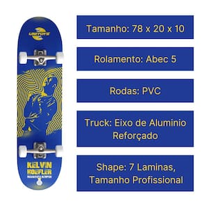 Com tamanho profissional de 78 x 20 x 10, rolamentos Abec 5, rodinhas de PVC, Truck de alumínio reforçado e shape de madeira Maple com 7 lâminas, fica até difícil de chamá-lo de infantil.