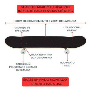 Medidas Aproximadas 80x20cm Construção do Shape: Composição especial com 7 lâminas de madeira indicado até 120kgs Nose: 17,7 cm / Tail: 16,7 cm / Wheelbase: 35,5 cm . Truck Pro liga de aluminio 129 mm Lixa inclusa e já colada Roda poliuretano 51 mm / Dureza 95A Rolamento abec 5 importado Parafuso Phillips Porca N8 Desenho do shape aplicado no papel