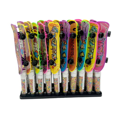 Cada display vem com 30 unidades do Skate Pop, facilitando a distribuição em grandes grupos ou para revenda. O design do skate é atrativo e projetado para captar a atenção, enquanto as balinhas dentro do tubo oferecem um doce deleite após a brincadeira.
