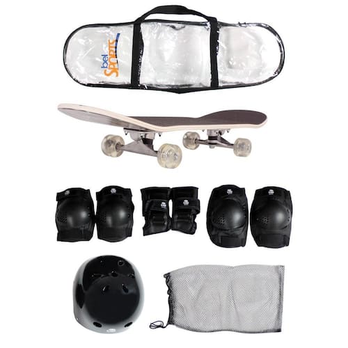 Skateboard semi-pro + kit proteção com abs p55 O skate belfix já vem com vários itens de segurança, capacete, joelheira, cotoveleira e luvas, tudo para garantir a segurança do seu pequeno, possui lâminas de maple, ilustração personalizada e côncavo diferenciado. A lixa autoadesiva colada na parte superior proporciona maior aderência e estabilidade aos seus pés. Ideal para diversão da garotada que pratica a modalidade street. Esse kit além de completo é perfeito para a prática do esporte com toda a proteção. Contém 1 skate semi profissional 1 capacete 1 par de joelheiras 1 par de cotoveleiras 1 par de luvas 1 sacola plástica para transporte Descrição técnica Abec dos rolamentos: abec 5 Diâmetro das rodas: 51 mm Distância entre os eixos: 33,5 cm Dureza das rodas: 100a Largura das rodas: 31 mm Largura do shape: 20 cm Material das rodas: poliuretano Material do shape: maple Material dos rolamentos: aço Quantidade de lâminas: 09 Suporta até: 80 kg Dimensão produto a x l x c : 10 x 20 x 78 cm Dimensões embalagem a x l x c : 19 x 79 x 22 cm Peso embalagem: 3 kg Código de barras: 7896777941201 Ean: 7896777941201