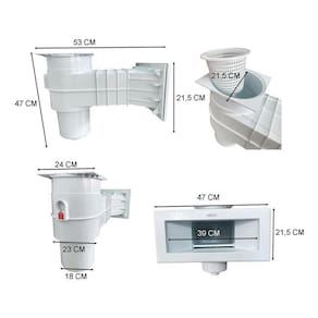Fabricados em termoplástico de alta qualidade abs , saída para acoplamento de aspiração, o que reduz o custo da obra. Nos modelos boca larga e boca pequena existe o sistema de regulagem de altura, adaptando-se aos diferentes tipos de revestimentos no piso. Sua instalação deverá ser feita sempre na parede que fizer oposição ao fluxo de retorno da piscina; e de preferência contrário as correntes de vento de maior freqência facilmente constatadas no inicio das obras posicionamento e construção da piscina possibilitando desta forma o perfeito funcionamento do sistema sem oposição de forças.