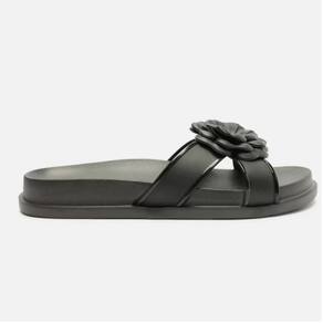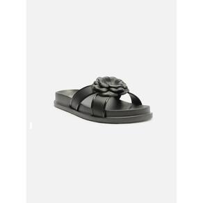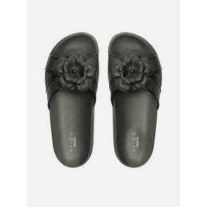 Descrição: Chinelo slide feminino preto. O sapato tem salto rasteiro, palmilha com formato anatômico e inscrição do nome da marca. Possui solado de EVA e ponta redonda. Traz tiras largas cruzadas sobre os dedos e com aplicação de flor. Deixa parte do pé à mostra. Referência: Z1912400020001 Marca: Brizza Arezzo