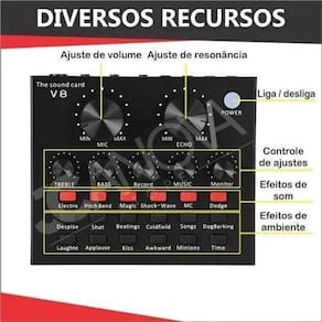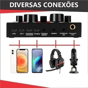 Esta placa de som multifuncional ao vivo tem 12 tipos de sons eletrônicos e 12 tipos de efeitos sonoros, que suporta o uso móvel duplo. Também é compatível com telefones ios e android. Características: