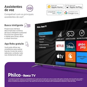 Smart TV Philco 60” 4K UHD P60CRA, Tela LED 60”, Resolução UHD (3840 x 2160), Frequência: 60Hz, Processador: Quad Core, Sistema Operacional: Roku TV, HDR10, Dolby Audio, Potência de áudio: 2 x 12W RMS, Conectividade: Wi-Fi e LAN (RJ-45), Entradas: 4 HDMI, 2 USB, RF, Saída Digital Óptica, Bivolt.Vendido e entregue por Philco Oficial