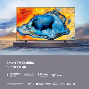 Smart TV DLED 65 4K Toshiba 65C350NS VIDAA com 4 HDMI e 2 USB. Sistema operacional VIDAA, Wi-Fi integrado, Bluetooth 5.0. Resolução 4K, taxa de atualização de 60 Hz. Brilho de 300 cd/m² e contraste de 1400:1. Suporte VESA 300x400. Consumo médio de 160W.