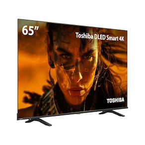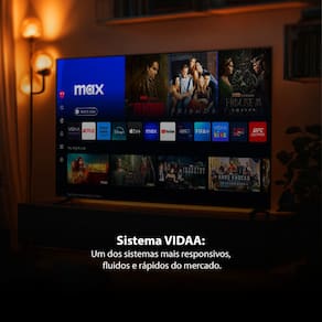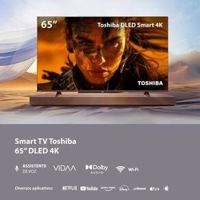 Smart TV DLED 65 polegadas 4K com sistema operacional VIDAA, áudio Dolby Audio, Wi-Fi integrado, Bluetooth 5.0, 4 entradas HDMI e 2 portas USB. Possui espelhamento de tela e comando de voz.