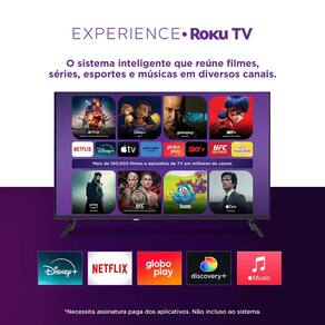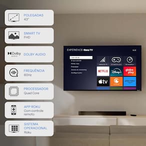 A MultiExperience Roku TV Smart 43 conta com a qualidade Dolby Áudio e imagem Full HD, sistema operacional Roku TV.
