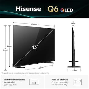 A Smart TV Hisense 43Q6QV de 43" oferece uma experiência envolvente e incrível de entretenimento na sua casa. Equipada com o sistema VIDAA U9, a TV 43Q6QV proporciona uma navegação rápida, intuitiva e fácil acesso aos seus conteúdos favoritos. Com a tecnologia avançada Dolby Vision, HDR, HDR10, HLG, Filmmaker Mode, Dolby Gaming, desfrute de alta qualidade de imagem e combinado ao Dolby Atmos, desfrute de um áudio imersivo de alta qualidade, ideal para filmes, jogos e esportes. Com Modos dedicados para games e esportes garantem uma visualização aprimorada, enquanto o controle que pode ser acionado por voz facilita seu dia a dia. Além disso, é possível espelhar a tela de dispositivos móveis para a TV através do Miracast , ampliando as opções de visualização e entretenimento. Compatibilidade Alexa e Google, permite integração na sua casa inteligente. Descubra o mundo de possibilidades com a Smart TV Hisense 43Q6QV, combinando design elegante com desempenho excepcional para uma experiência de visualização superior.