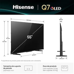 A Smart TV Hisense 55Q7QG de 55" oferece uma experiência envolvente e incrível de entretenimento na sua casa. Equipada com o sistema Google TV, a TV 55Q7QG proporciona uma navegação rápida, intuitiva e fácil acesso aos seus conteúdos favoritos. Com a tecnologia avançada Dolby Vision, HDR, HDR10, HDR10+, HDR10+ Adaptative, HDR+ Gaming, HLG, Dolby Vision IQ, Dolby Gaming, Filmmaker Mode, , desfrute de alta qualidade de imagem e combinado ao Dolby Atmos, desfrute de um áudio imersivo de alta qualidade, ideal para filmes, jogos e esportes. Com Modos dedicados para games e esportes garantem uma visualização aprimorada, enquanto o controle que pode ser acionado por voz facilita seu dia a dia. Além disso, é possível espelhar a tela de dispositivos móveis para a TV através do MiraCast , ampliando as opções de visualização e entretenimento. Compatibilidade Alexa e Google Home, permite integração na sua casa inteligente. Descubra o mundo de possibilidades com a Smart TV Hisense 55Q7QG, combinando design elegante com desempenho excepcional para uma experiência de visualização superior.