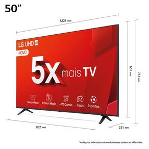 Smart TV LG 50 polegadas 4K LED UHD com webOS, Wi-Fi integrado, 4 entradas HDMI, 2 entradas USB, Bluetooth, conversor digital integrado, sistema de TV ISDB-TB, resolução Ultra HD 4K, taxa de atualização de 60Hz.