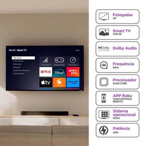 Smart TV com sistema operacional Roku TV, tela LED 4K UHD, Wi-Fi integrado, comando de voz, espelhamento de tela, Dolby Audio, compatível com Alexa e Google Home.Infelizmente não temos estoque do produto que você está procurando no momento.