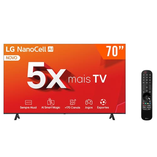 A nova Smart TV 4K 70" exibe cores mais ricas, apresentando seu conteúdo favorito de forma mais vívida e natural. O processador AI a5 4K Ger7 aprimora a TV para proporcionar a você uma experiência imersiva. Do controle de voz ao conteúdo personalizado, o ThinQ AI torna a experiência com a TV muito mais inteligente.
