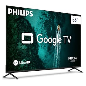 Smart TV Philips 65 polegadas com resolução 4K, Google TV, comando de voz, processador Quad Core, painel LED, design sem bordas, frequência 60 Hz, proporção de tela 16:9, ângulo de visão 178º, brilho 300 cd/m², taxa de contraste dinâmico 1:200.000, tempo de resposta 8 ms.