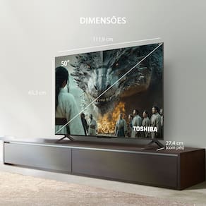 Smart TV QLED 50 4K Toshiba Google TV com tecnologia QLED e resolução 4K. Sistema operacional Google TV com acesso a aplicativos como Netflix, YouTube, Prime Video, Disney+ e Max. Som Dolby Audio com Dolby Vision Atmos, potência de 16W RMS. Espelhamento de tela, controle parental, controle remoto com comando de voz. Design Superslim. Conectividade Wi-Fi, 3x HDMI 2.0, 2x USB 2.0, 1x AV, 1x entrada P2, 1x Óptica, 1x conversor digital, 1x Lan Ethernet.