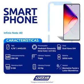 SMARTPHONE INFINIX NOTE 40 5G 6.78 OCTA CORE 256GB 8GB CÂMERA TRIPLA Se você valoriza tecnologia de ponta, desempenho excepcional e um design moderno, o Infinix note 40 5G é a escolha perfeita! Proporcionando as tecnologias mais recentes e um desempenho de alta performance, é a escolha ideal para quem busca um aparelho incrível e recursos premium. Descubra agora o poder do Infinix Note 40 5G na palma da sua mão. Confira mais detalhes: