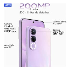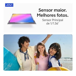 - Câmera dupla - Principal de 200MP com OIS e Ultra Wide, Selfie de 32MP; - Zoom digital de até 30x e gravação em 4K @30fps; - Design fino e elegante com proteção IP69; - Tela AMOLED de 6.83"" FHD+ com taxa de atualização de 120Hz e 1.07 bilhão de cores; - Processador Mediatek Dimensity 7360-Turbo Octa-Core de até 2.5GHz e 8GB RAM + até 8GB RAM expansível; - Armazenamento de 512GB para você guardar tudo sem preocupação; - Leitor de impressão digital na tela e reconhecimento facial para mais segurança;- - Bateria de 7000mAh com carregamento ultrarrápido de 90W; - Sistema Android 16; - Conectividade completa com 5G, Wi-Fi 6, Bluetooth 5.4 e NFC; SISTEMA OPERACIONAL - Sistema Operacional + Versão: Android | 16.0 - Plataforma: 64bit - Loja de Aplicativos: Play Store / JOVI Store PROCESSADOR - Modelo do Processador: Media Tek Dimensity 7360-Turbo - Velocidade do Processador: Octa-core até 2.5GHz BANDAS - 4G Bandas: B38/B40/B41/B42/B43/B48/B1/B2/B3/B4/B5/B7/B8/B12/B13/B17/B18/B19/B20/B26/B28/B66 - 5G Bandas: n1/n2/n3/n5/n7/n8/n20/n26/n28/n38/n40/n41/n66/n77/n78 CONECTIVIDADE - Bluetooth: Bluetooth v5.4 - Conexão Wi-Fi: 802.11a/b/g/n/ac/ax 2.4GHz+5GHz, SISO - Roteador Wi-Fi: Sim - NFC: Sim - 2 Chips: Sim - Tipo de SIM: Nano-SIM - USB: USB 2.0 - USB Conector: USB Type-C SENSORES - Tipos de Sensores: Acelerômetro, Luminosidade, E-Compass, Proximidade - Segurança: Leitor de impressão digital na Tela, Reconhecimento Facial DISPLAY - Tecnologia: AMOLED - Taxa de atualização: 120Hz - Tamanho do Display: 6.83" - Número de Pixels: 2800 1260 - Quantidade de Cores: 1.07B - Vidro Reforçado: Sim, SCHOTT CÂMERA TRASEIRA - Resolução: 200MP OIS + 8MP (Ultra Wide) - Abertura: F1.88 + F2.2 - Zoom: Zoom Digital até 30x - Estabilizador Óptico de Imagem (OIS): Sim - Foco Automático (AF): Sim - Flash: Flash-LED | Aura Light CÂMERA FRONTAL - Resolução: 32MP - Abertura: F2.2 - Flash Frontal: Sim, na tela MEMÓRIA - Memória Interna total compartilhada: 512GB(*) - Suporte a Cartão de Memória: Não - Memória RAM: 8GB - Memória RAM Plus: até 8GB BATERIA & CARREGAMENTO - Capacidade da Bateria (mAh): 7000mAh - Tipo de Bateria: Ions de Lítio - Voltagem: Bi-Volt - Compatível com Carregamento Rápido: Sim (90W) - Carregamento Sem Fio: Não DIMENSÕES - Dimensões do Aparelho (mm): 76,20 x 163,70 x 7,59 - Peso do Aparelho (g): 200 Kit Embalagem: Aparelho celular, carregador, cabo USB, Extrator de Chip, Capa Protetora, Cartão de Garantia e Guia Rápido