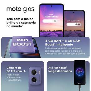 Acima de 6"Smartphone Motorola Moto G05 4G 128GB 4GB RAM + 8GB RAM Boost Câmera Traseira 50MP Frontal 8MP Tela 6.7" Violeta + Ubook - Livros Digitais