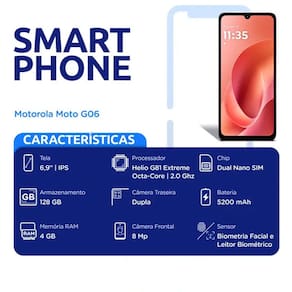 Rodando o Android 15, o G06 oferece uma navegacao rapida, limpa e atualizada, do jeitinho que a gente gosta. Equipado com o processador Helio G81 Extreme Octa-Core de 2,0 GHz, ele e agil o suficiente para as tarefas do dia a dia e ate um pouco mais. Sao 4GB de RAM fisicos, mas, com a tecnologia RAM Boost Inteligente, voce pode chegar a ate 8GB, usando parte do armazenamento interno para dar aquele gas extra na performance.