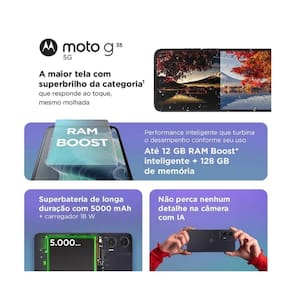 Smartphone motorola moto g35 5g 128gb 12gb ram boost verde desempenho e conectividade de última geraçãodescubra o poder do motorola moto g35 5g, um smartphone projetado para oferecer desempenho e conectividade incomparáveis. Com tecnologia 5g, você experimenta velocidades de download ultrarrápidas, streaming fluido e navegação sem interrupções. Características:ean: 7892597354320marca: motorolamodelo: xt2433-1cor: verdelinha: g35memória interna: 128gbmemória ram: 12gb ram boost a memória ram boost, também conhecida como ram virtual ou ram plus: é uma função que amplia a memória ram de um smartphone usando parte do armazenamento interno do aparelho sistema operacional: android 14tamanho da tela: 6.7resolução da tela: 1080 x 2400 pixelsresolução da câmera traseira: 50mp + 8mpresolução da câmera frontal: 16mpcapacidade da bateria: 5000mahmodelo do processador: t760 unisocdual chip: nãotecnologia de rede: 5gcódigo homologação anatel: 07104-24-00330conteúdo da embalagem:01 smartphone verde - vegan leather01 manual01 cabo usb-a / usb-c01 carregador turbopower01 ferramenta de remoção do chip dimensões da embalagem:altura: 18cmlargura: 12cmprofundidade: 16cmpeso: 0,400kggarantia: 12 meses Homologação Anatel: 142932213865 Marca: Não Informado Ean: 7892597354320