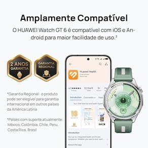 Smartwatch Huawei GT6 de 46mm na cor Preta, com tela colorida AMOLED de 1,47 polegadas (46 mm) e resolução 466x466 pixels (317 PPI). Possui sistema operacional Harmony OS, conectividade NFC e Bluetooth 6.0, e GNSS L1/L5 (GPS, GLONASS, GALILEO, BDS, QZSS). Armazenamento interno de 64 GB e 64 MB de RAM. Caixa em aço inoxidável (cor prata) com pulseira em fluoroelastômero (cor preta), ajustável para pulsos de 140 a 210 mm. Bateria recarregável Li-ion com duração de até 21 dias (uso máximo), até 12 dias (uso normal), até 7 dias (com AOD) ou até 40 horas (modo esportes ao ar livre). Carregamento sem fio. Resistente à água 5 ATM e à poeira IP69. Inclui alto-falante, microfone, botão Home (coroa giratória) e botão lateral. Sensores: acelerômetro, giroscópio, magnetômetro, frequência cardíaca, barômetro, temperatura, luz ambiente. Compatível com Android 9.0 ou posterior e iOS 13.0 ou posterior. Modelo: Atum-B19F. Dimensões do produto sem embalagem (AxLxP): 464610,95 mm. Peso do produto sem embalagem: 0,07 kg.Processador