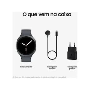 Smartwatch Samsung Galaxy Watch8 com tela Super AMOLED de 1.47 polegadas, processador Exynos W1000, 2GB de RAM e 32GB de memória interna. Possui NFC, Bluetooth 5.3 e Wi-Fi. Inclui diversos sensores como acelerômetro, barômetro, sensor cardíaco elétrico, sensor de temperatura infravermelho, entre outros. Bateria de 435mAh.Processador