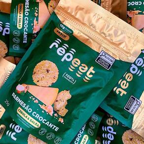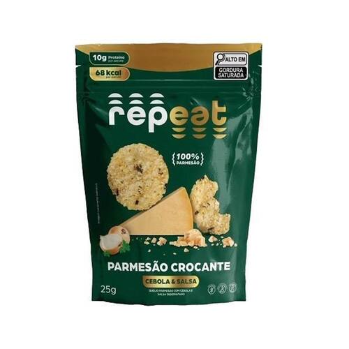 O snack de parmesão crocante cebola e salsa repeat é feito com apenas 3 ingredientes: queijo parmesão, cebola e salsa desidratados. O queijo é maturado por 6 meses e assado no forno, ele elimina parte da gordura e concentra o sabor umami do queijo, sendo uma opção prática, saudável e perfeita para qualquer hora do dia.