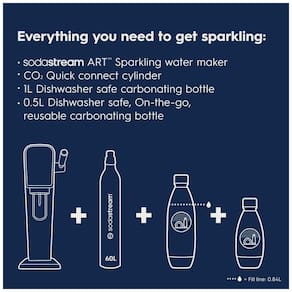 O SodaStream Art Sparkling Water Maker celebra a arte de fazer suas próprias bebidas gaseificadas frescas em casa. Com uma alavanca, transforme água sem gás em água gaseificada fresca e personalize-a conforme desejar. O Art apresenta um design retrô com uma alavanca de carbonatação única. Carbonatação manual, sem necessidade de pilhas. Uma garrafa reutilizável SodaStream pode salvar milhares de garrafas plásticas descartáveis. Eleve seu jogo de hidratação com o SodaStream ART Sparkling Water Maker Starter Pack, transformando água da torneira em água gaseificada refrescante com um simples puxão da alavanca, ideal para criar bebidas gaseificadas para encontros em família ou momentos de refrescância solo. Este kit contém uma garrafa de carbonatação Slim e uma OnTheGo MyOnlyBottle com alça para transporte, tornando fácil levar suas bolhas com você para qualquer ocasião. Descubra a elegância elegante do SodaStream ART na cor branca, seu design elegante com detalhes metálicos retrô complementa qualquer decoração de cozinha, sendo a combinação perfeita de forma e função para a vida moderna. Aproveite a carbonatação eco-amigável com o SodaStream ART, alimentado por cilindros de CO2 reutilizáveis, cada cilindro carbonata até 16 galões de água, equivalente a 120 garrafas plásticas, reduzindo sua pegada de carbono enquanto desfruta de bebidas gaseificadas infinitas em casa. Liberte sua criatividade com o SodaStream ART, compatível com os sabores SodaStream, Pepsi, Bubly, Mountain Dew e muitos mais! Misture e combine para criar suas próprias bebidas exclusivas, seja você fã de água gaseificada clássica ou de misturas com sabores únicos. Experimente a conveniência do SodaStream ART com sua inserção de garrafa de encaixe rápido e fácil de usar, carbonatando rapidamente sua água com o mínimo esforço, tornando-o adequado para manhãs agitadas ou encontros espontâneos com amigos. As máquinas SodaStream ART são compatíveis apenas com o cilindro CO2 de conexão rápida da SodaStream.