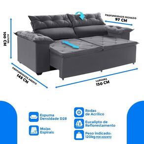 Ele possui encosto reclinável em cinco posições, proporcionando-lhe mais conforto na hora do descanso. E não para por aí: seu assento retrátil conta com espuma D28 e molas espirais, transformando seu sofá em uma verdadeira cama para assistir seu filme preferido.