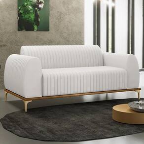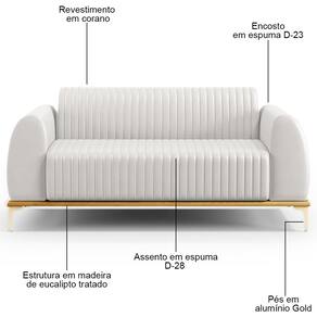Sofá Molino! A princípio, ele possui base em madeira de eucalipto envernizada com pés em alumínio, estrutura em misto de madeira com MDF e OSB e a parte estofada é em espuma D-23 no encosto e espuma D-28 no assento. Além desses detalhes, também é revestido em tecido PU branco, conferindo requinte e uma dose extra de durabilidade e resistência.