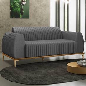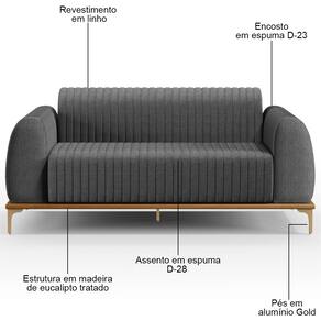 Sofá Molino! A princípio, ele possui base em madeira de eucalipto envernizada com pés em alumínio, estrutura em misto de madeira com MDF e OSB e a parte estofada é em espuma D-23 no encosto e espuma D-28 no assento. Além desses detalhes, também é revestido em linho cinza escuro, conferindo requinte e uma dose extra de durabilidade e resistência.